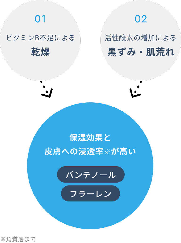 保湿効果の高いパンテノールと、様々な肌トラブルをサポートするフラーレンを配合。